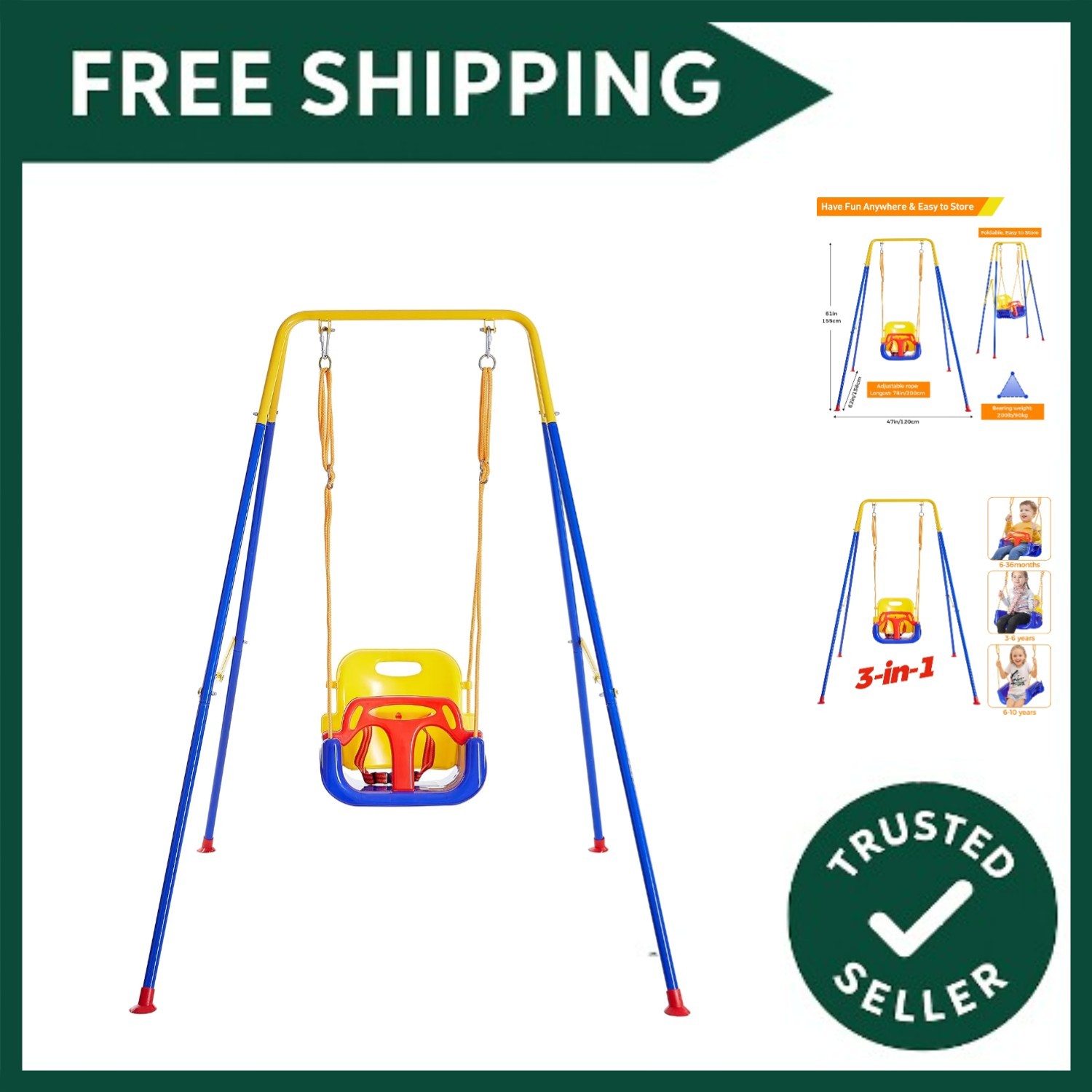 Toddler Swing Set 3-in-1 Baby Swing Outdoor/Indoor Toddler Swing&Jumper with Foldable Metal Stand Baby Swing Outdoor for Aged 6 Months to 10 Years