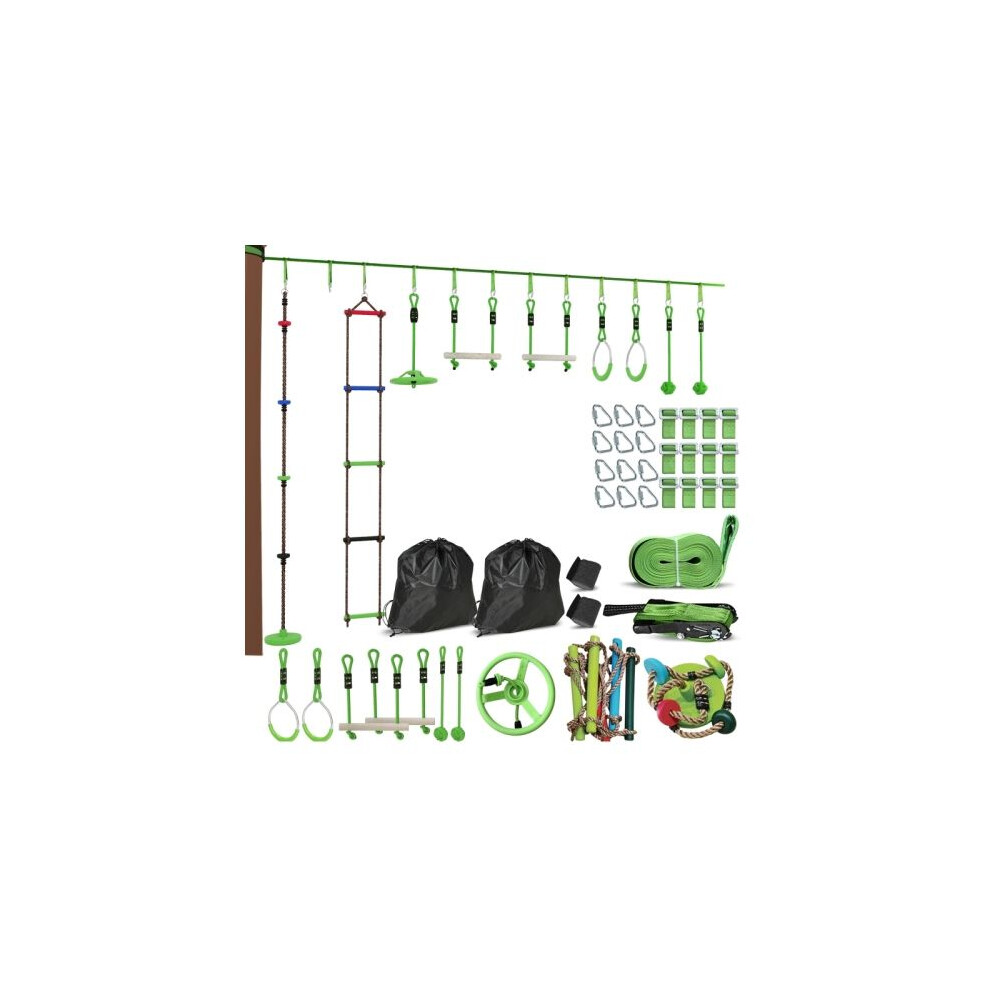 AIYAPLAY Obstacle Course for Kids, 32.8ft 10 Piece Zip Line Stackline for Kids, with 2 Monkey Bars, 2 Gym Rings, Rope Ladder, Nest Swing, Tree Protector, 2 Bags, Hanging Tray, 2 Rope Knots