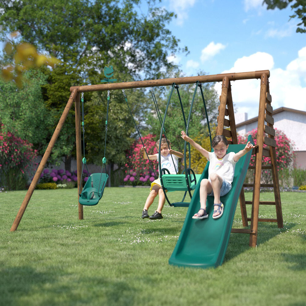 Soulet Prune Childrens Double Wooden Swing Set with Slide 2.6m x 3.5m Set