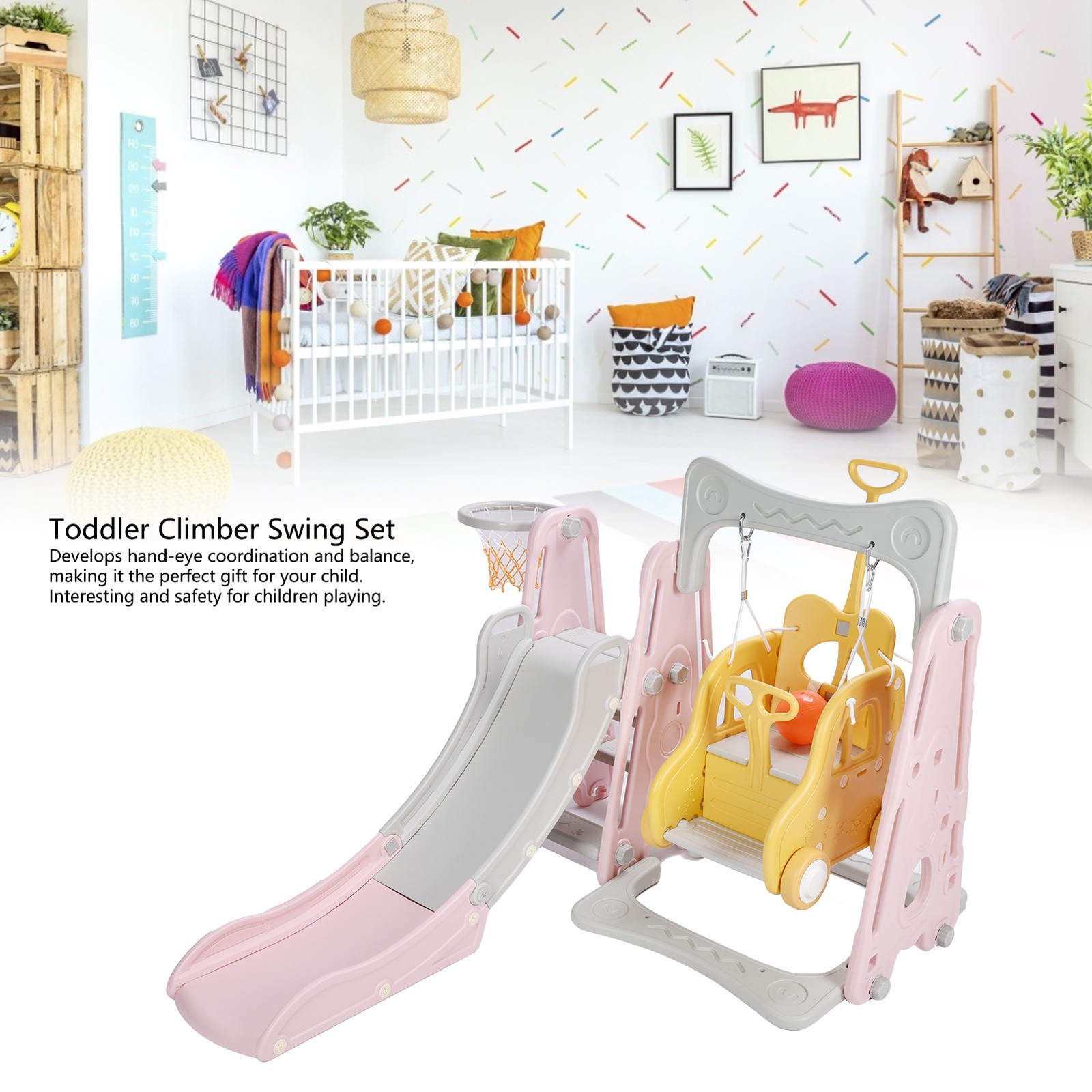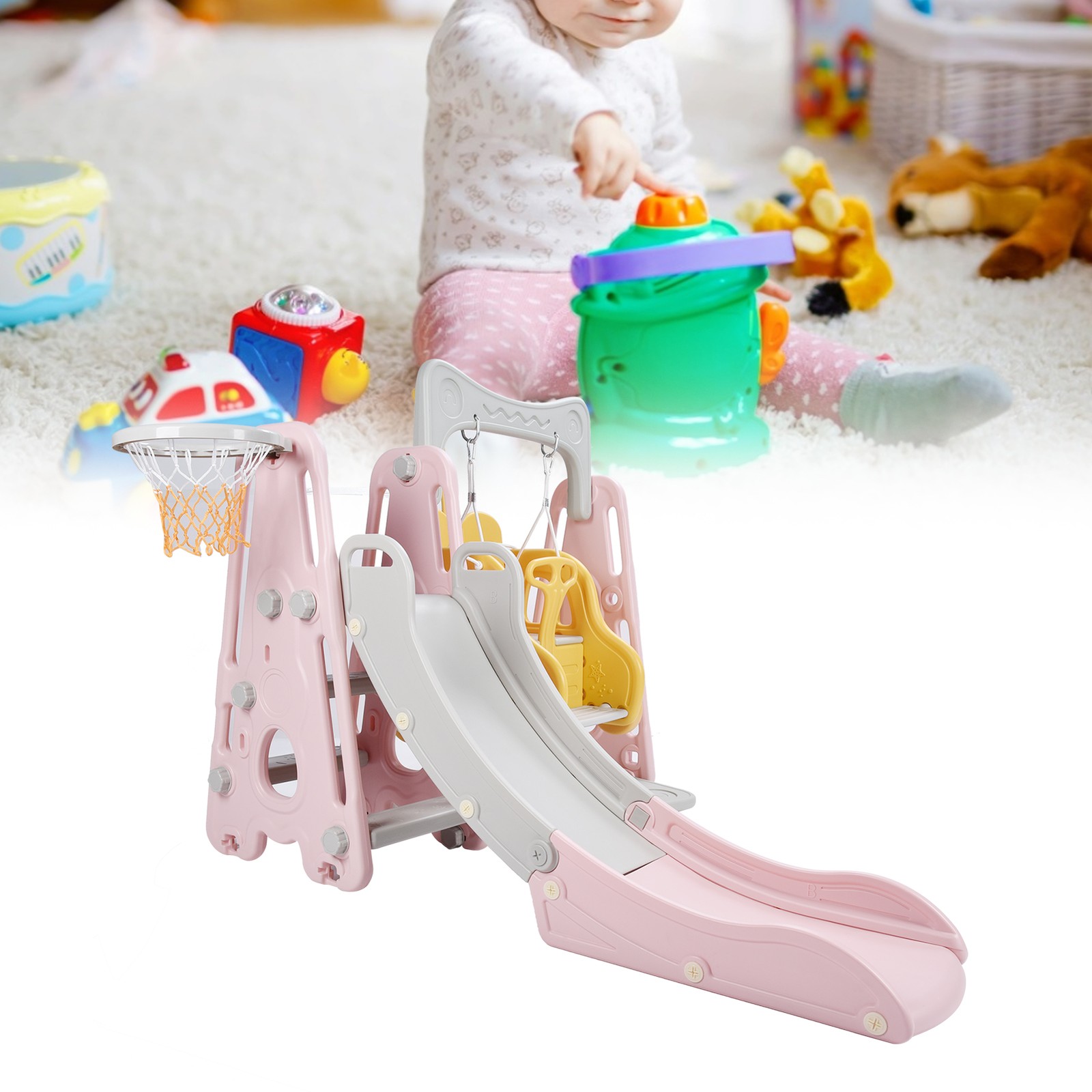 4-in-1 Kids Swing and Slide Set Toddler Climber and Slide Set Children's Play Climbing Slide Set with Basketball Hoop