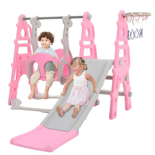 Warmiehomy Kids Slide Swing Set, 4 in 1 Toddler Slide Playset with Basketball Hoop, Climber Frame, Swing, Indoor Outdoor Playground for Girls Age 1 2 3, Birthday for Kids Age 1-3,Pink