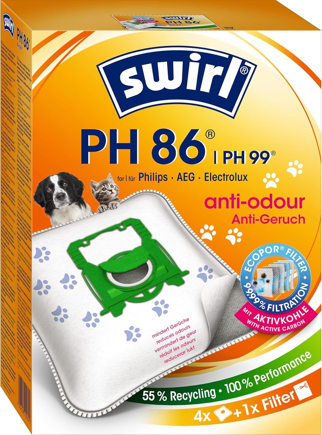 Swirl PH 86 Ecopor Anti-Odour Vacuum Cleaner Bags, 4-Pack, 99.9% Dust Filtering