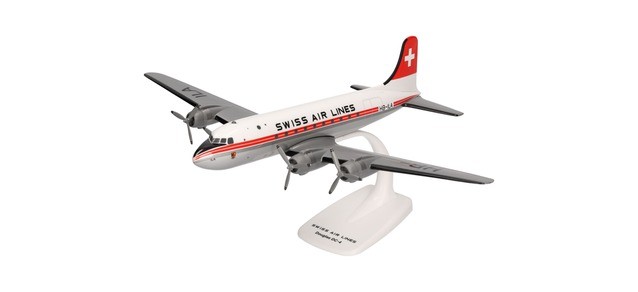 Herpa Snap-fit airplane model Swissair Douglas DC-4 on scale of 1:125, plastic miniature with pedastal, model building, collectors edition