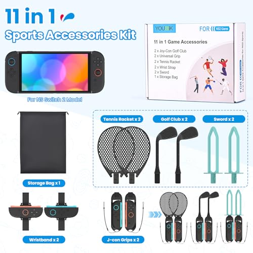 Younik Switch 2 Sports Accessories, 11 in 1 Switch 2 Sports Bundle with Golf Clubs, Tennis Rackets, Sword Grips, Sword Grips and Wrist Straps, Family Accessories Kit Compatible with NS Switch 2 (2025)