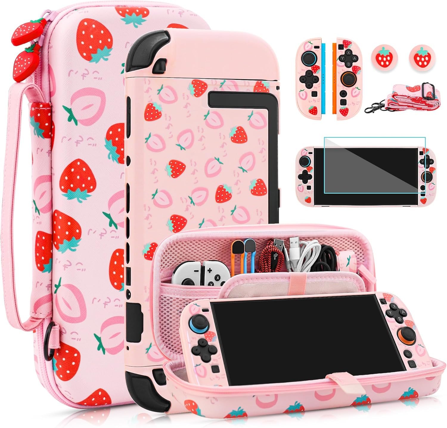 FANPL Cute Carrying Case for Nintendo Switch 2, Protective Cover Accessories Bundle with Travel Skin, Hard Shell, Adjustable Shoulder Strap, Thumb Grips, Screen Protector (Pink Strawberry)