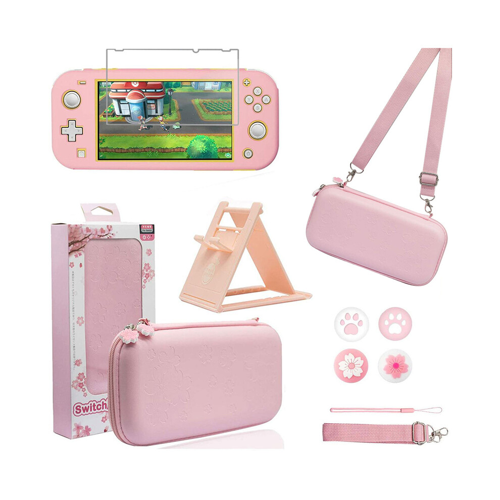 (Case Bundle 1) Pink Travel Case Accessories For Nintendo Switch Lite Cute Sakura Poch Carrying Bag With Strap Stand Temper Film Glass Protector