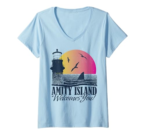 Womens Jaws Amity Island Welcomes You Sunset V-Neck T-Shirt