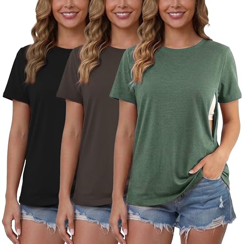 Love2Mi Set of 3 Nursing Shirts with Hidden Zip Breastfeeding Opening Short Maternity Top Breastfeeding T-Shirt for Pregnant Women, Black/Anthracite/Heather Green, M