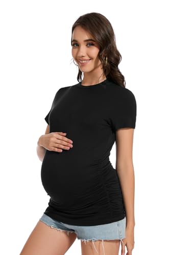 Women's Maternity Tops Short Sleeve Round Neck T Shirts Flower Pattern Ruched Sides Pregnancy Clothes for Summer Black M