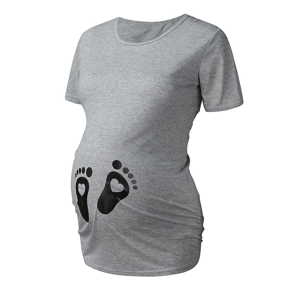 Women Maternity Short Sleeve Tops Cartoon Footprint Summer Ruched Sides Casual Stretchy Pregnancy T Shirts Grey L