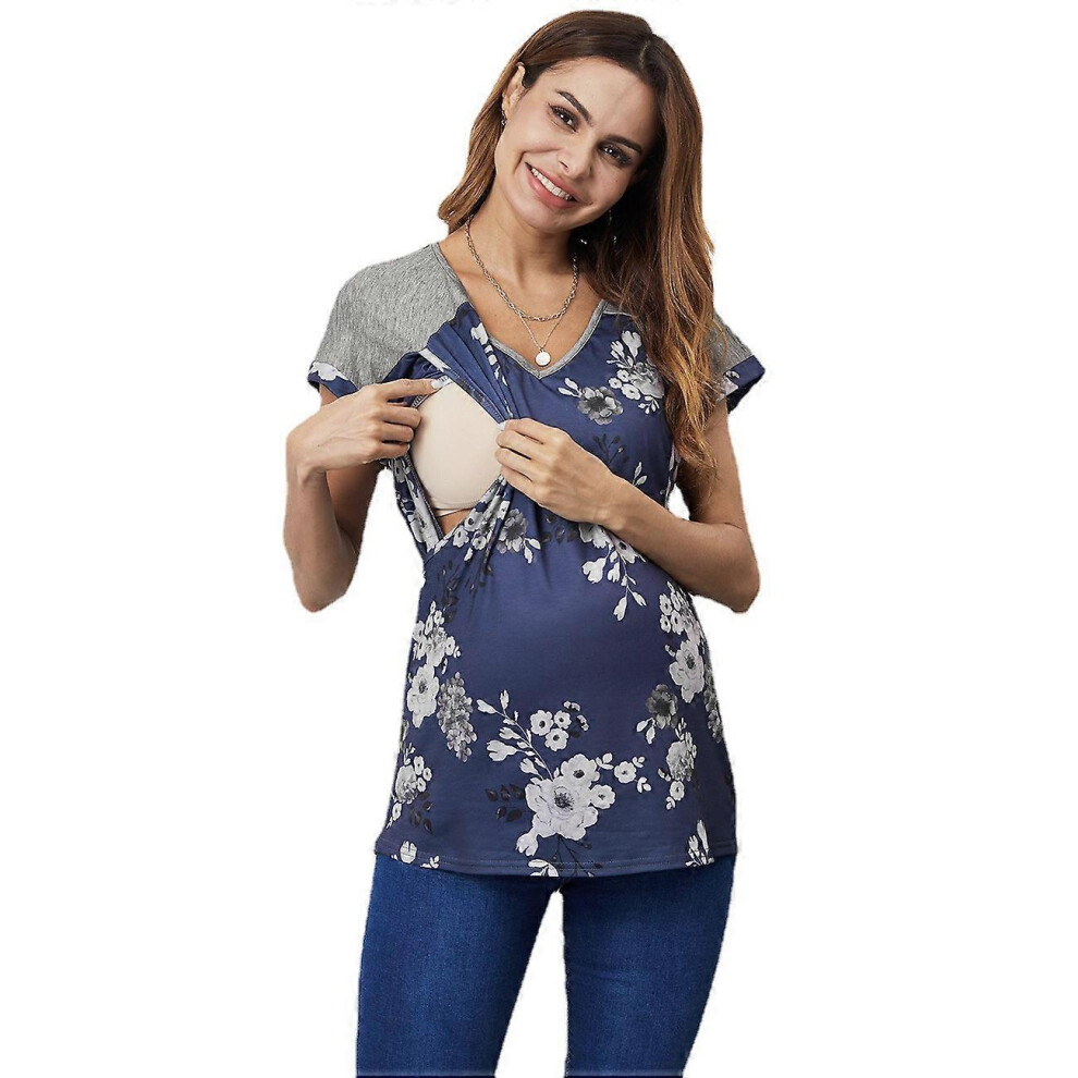 Nursing T Shirts for Women Short Sleeve Double Layer Breastfeeding Blouse Maternity Tops Summer Pregnancy Clothes Blue XL