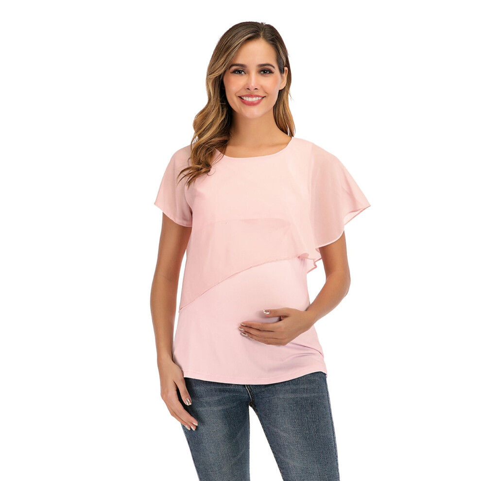 Nursing T Shirts for Women Short Sleeve Double Layer Breastfeeding Blouse Maternity Tops Summer Pregnancy Clothes Pink XL