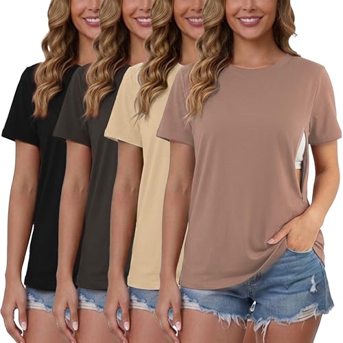 Love2Mi Set of 3 Nursing Shirts with Hidden Zip Breastfeeding Opening Short Maternity Top Breastfeeding T-Shirt for Pregnant Women, Apricot + Dark Pink + Anthracite + Black, M