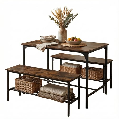 FurnitureR Dining Table with 2 Storage Benches, Industrial Dining Table Set with Wood-Effect Top and Metal Frame, Space Saving Table and Bench Set for Kitchen, Dining Room, Rustic Brown