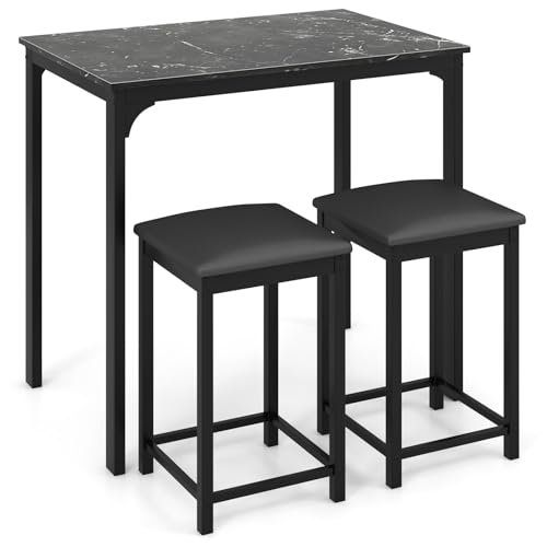 COSTWAY 3 Pieces Bar Table Set, Kitchen Counter Table and 2 Bar Stools with PU Leather Pad, Metal Frame Breakfast Dining Table Sets for Home, Pub, Living Room (Black)