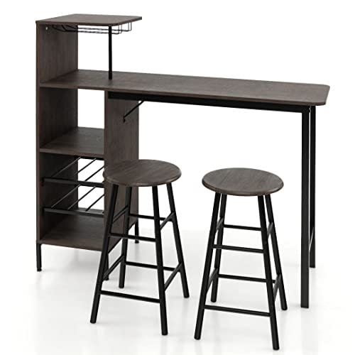 COSTWAY 3 Piece Bar Table Set, Kitchen Table and Stools with Glass Holders, Wine Racks, Storage Shelves & Adjustable Foot Pads, Counter Height Dining Table Set for Bistro Living Room (Brown)
