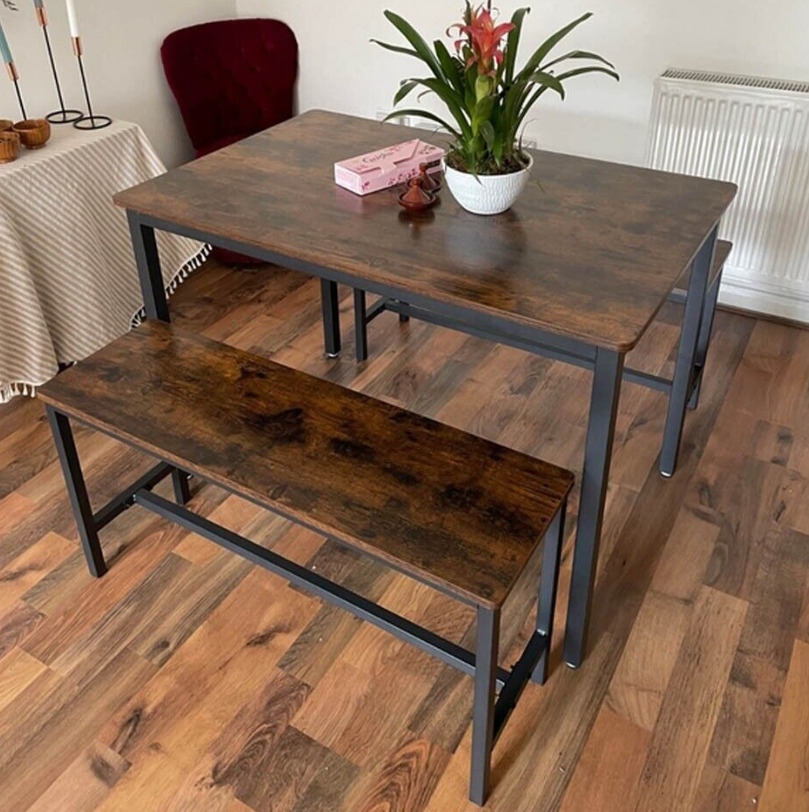 Dining Table and Bench Set Vintage Industrial Kitchen Rustic Metal Space Saving