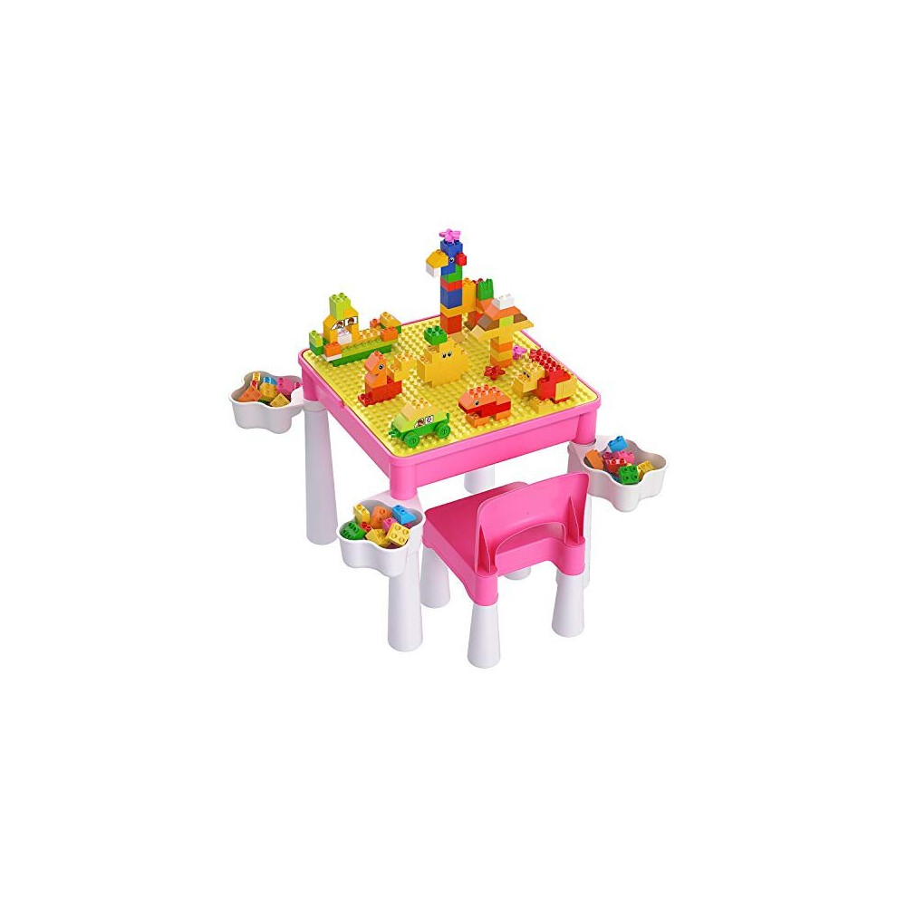 burgkidz Toddler Table and Chair Set, Plastic Kids Activity Table with Chair and 128 Piece Large Creative Bricks Building Construction Toys for Girls, Pink