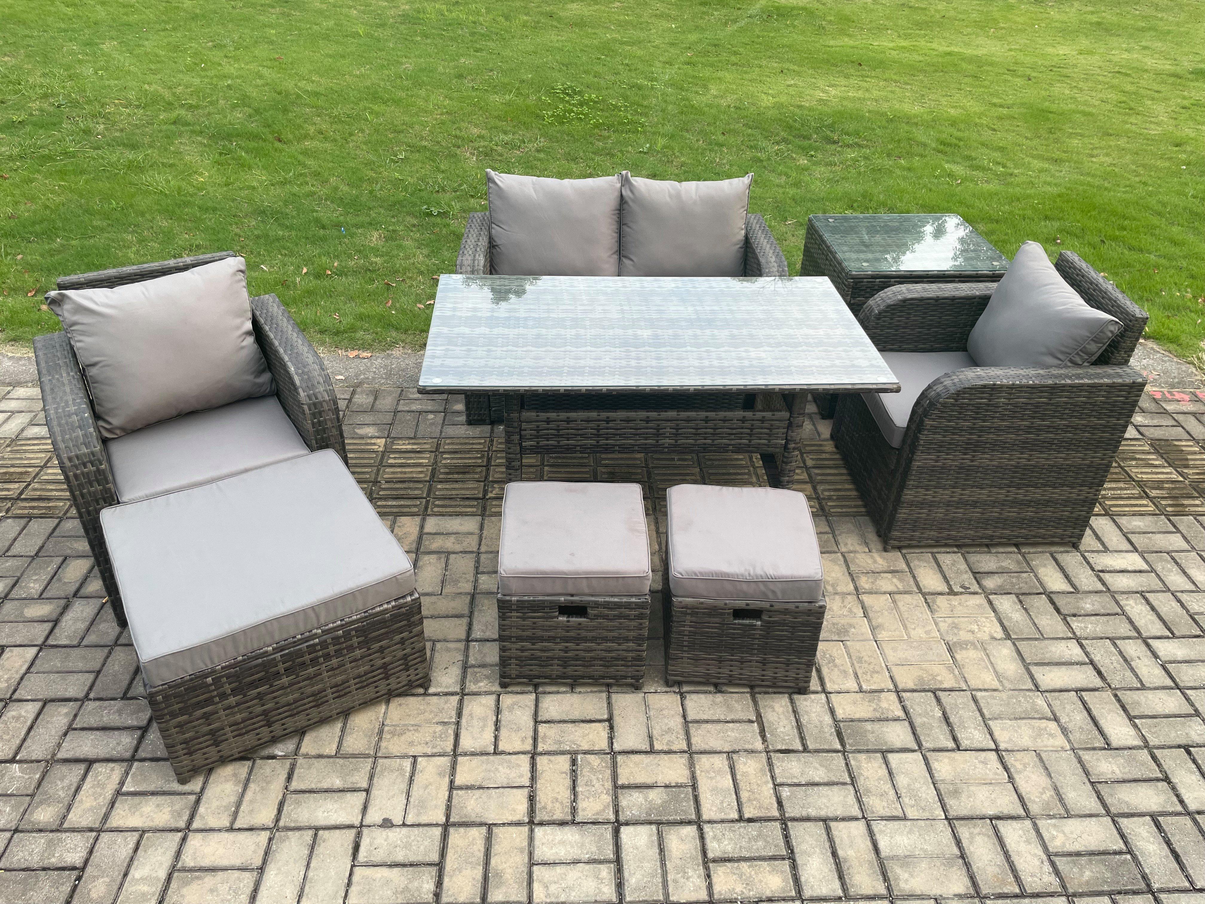 Rattan Outdoor Garden Furniture Set Rectangular Dining Table and Chair Sofa Set With 2 Side Tables 3 Footstool