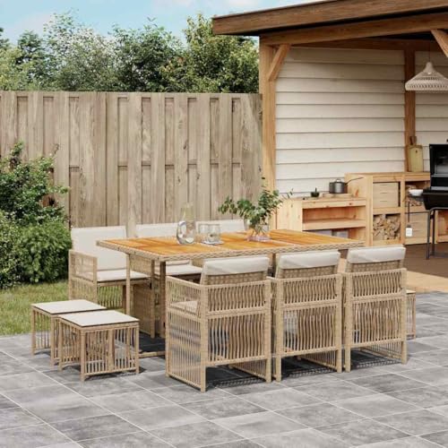 Hoopleep 11-Piece Garden Dining Set with Cushions, Beige Poly Rattan Outdoor Furniture Set, HDPE, Acacia Wood Table for Patio, 6 Chairs, 4 Stools