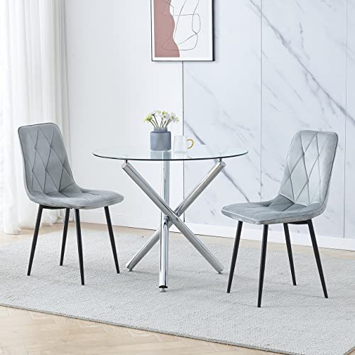 Menaka 5 Pieces Round Glass Dining Table and Grey Velvet Chairs Set Small Space for 4 People, Modern Kitchen Table with Chairs Set of 4 Restaurant (table with 2 grey chairs)