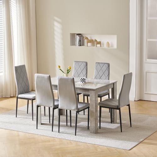 Homullel 7 Piece Dining Room Table and Chairs Set of 6 for Dining Room Kitchen, Modern Wooden Dining Table with 6 Chairs for Family Dinner Set (With 6Pcs Grey Velvet Chairs, 120cm Grey Marble Table)