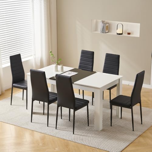 Menaka Modern White Dining Room Table and Chairs Set of 4 for Small Space, 5pcs Wood Kitchen Table with 4 Seats Chairs Set for Restaurant Dinette Space-saving (table and 6 black linen chairs)