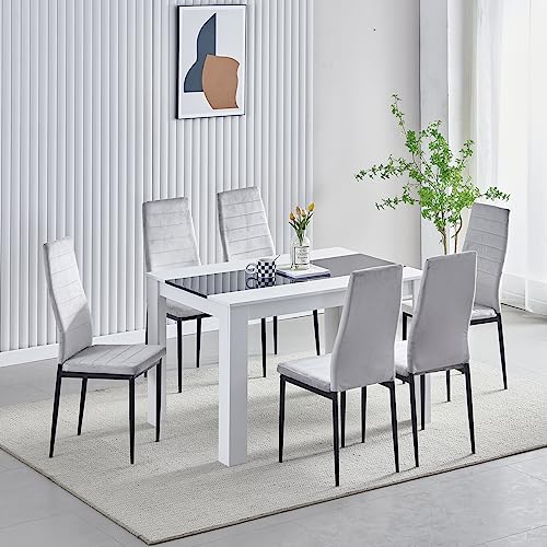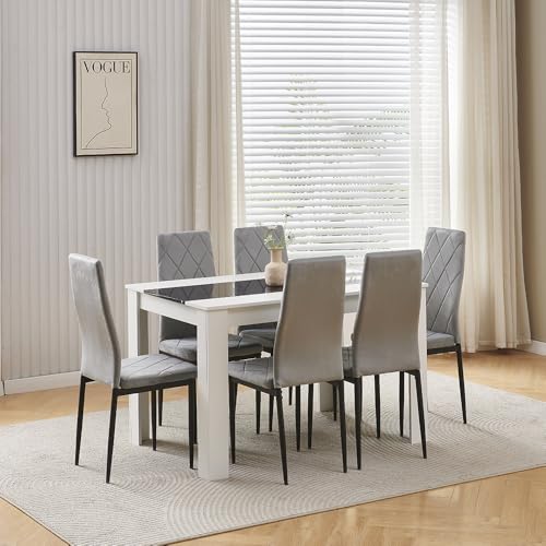 KOSY KOALA Kitchen Dining table Set Of 6 Dining Table And 6 Grey Velvet Chairs, Wooden White Black Table and 6 Grey Tufted Chairs