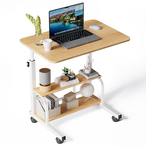 Warmiehomy Mobile Computer Desk with Storage Shelves, Height Adjustable Desk 60cmX40cmX89cm, Laptop Table on Wheels, Rolling Overbed Table for Home Office, White
