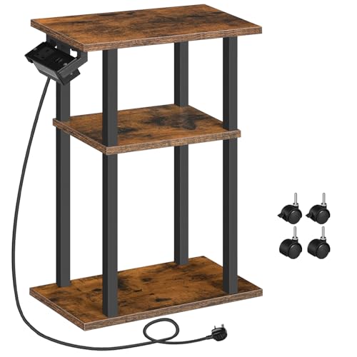 HOOBRO Slim Side Table with Charging Station, Small Sofa Table on Wheels, Narrow Nightstand Bedside Table with USB Ports and Outlet for Small Space, Living Room, Rustic Brown and Black EBF122KBZ01