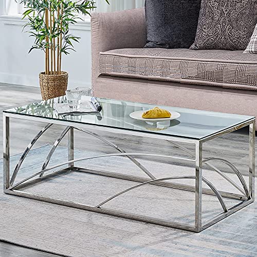 AINPECCA Stainless Steel Rectangular Glass Coffee Table Tea Table for Living Room- 120CM Modern Sleek Accent Center Table Lounge Table with Clear Tempered Glass(Silver)