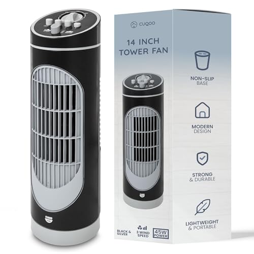 CUQOO 14 inch Table Top Tower Fan - 80° Bladeless Oscillating Fan with 3 Speed Levels and 2-Hour Timer, Lightweight for Bedroom, Living Room, Kitchen, Home Office (Black and Silver, 14 Inch)