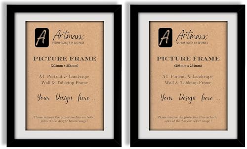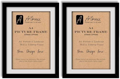 Artmaxx A4 Black Photo Frame, for Graduation Certificates and A4 Pictures, for Table Top or Wall Mount, Transparent, Non-breaking Acrylic Glass Front, Solid Wood (Pack of 2)