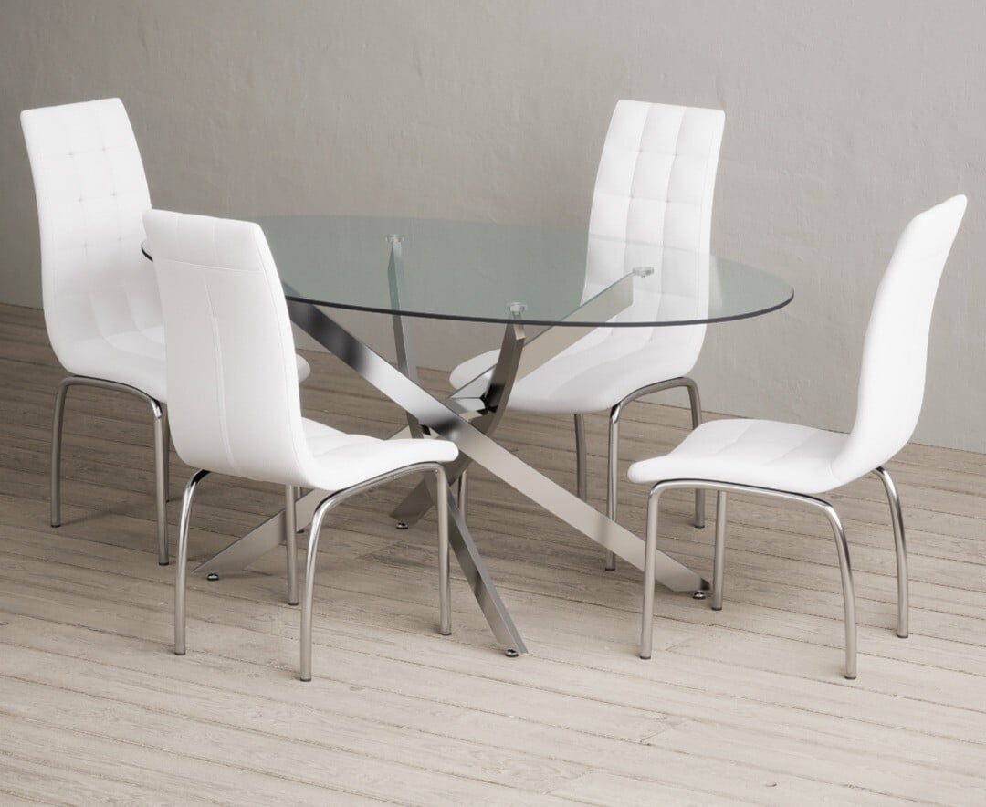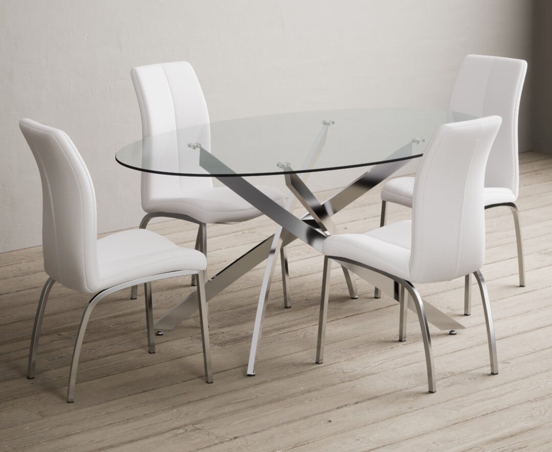 Bernini 165cm Oval Glass Dining Table with 4 White Vigo Chairs