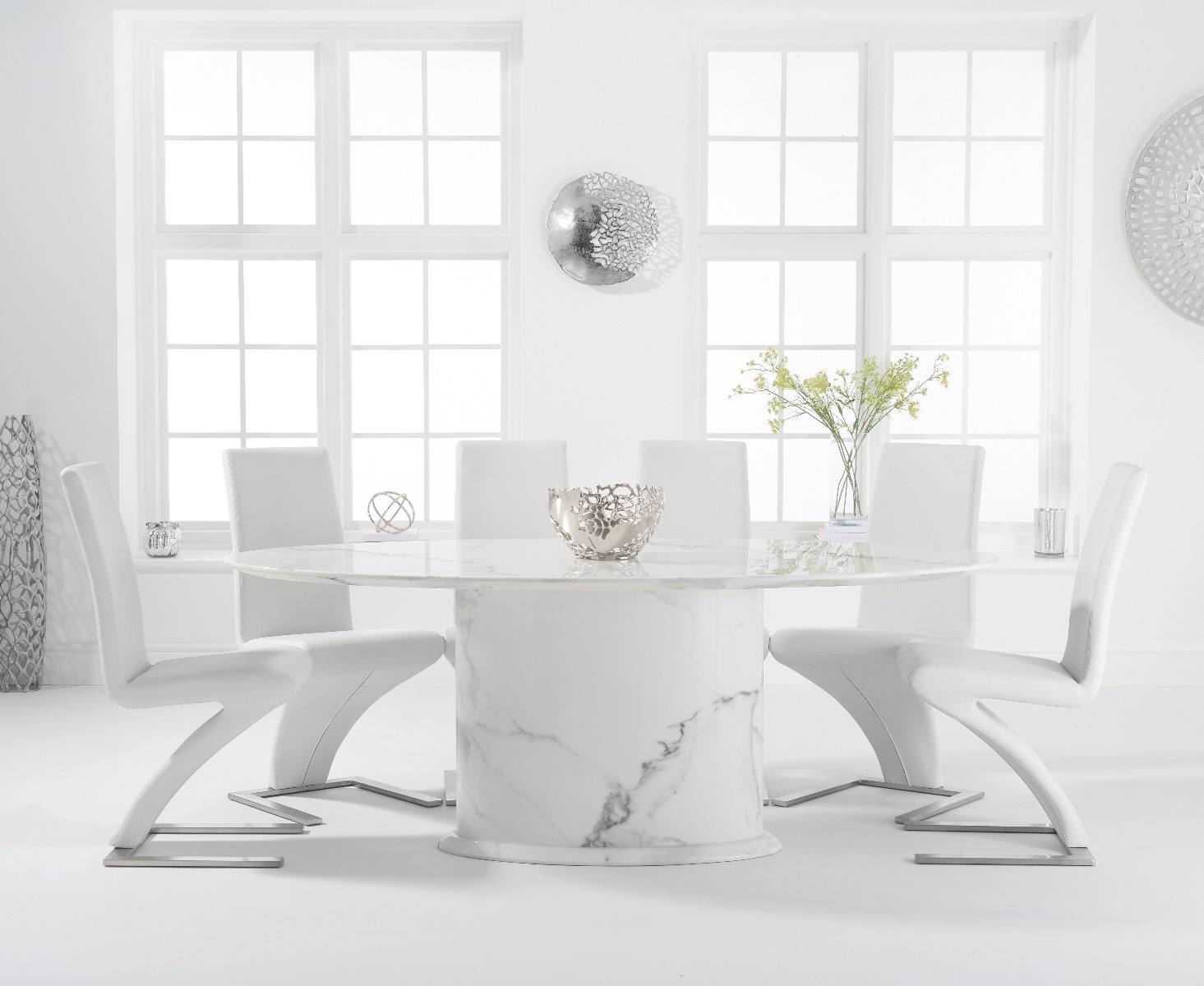 Colby 200cm White Oval Marble Dining Table with 6 White Aldo Chairs