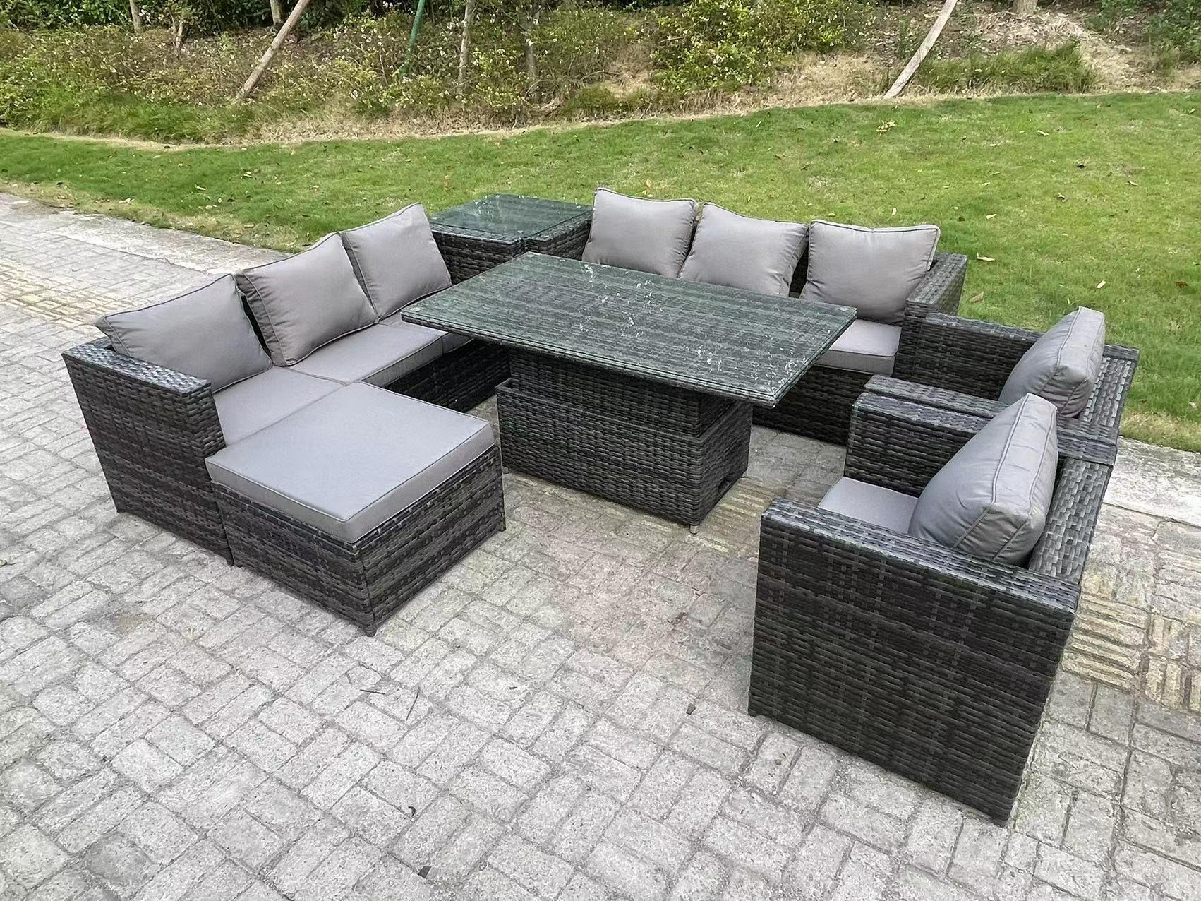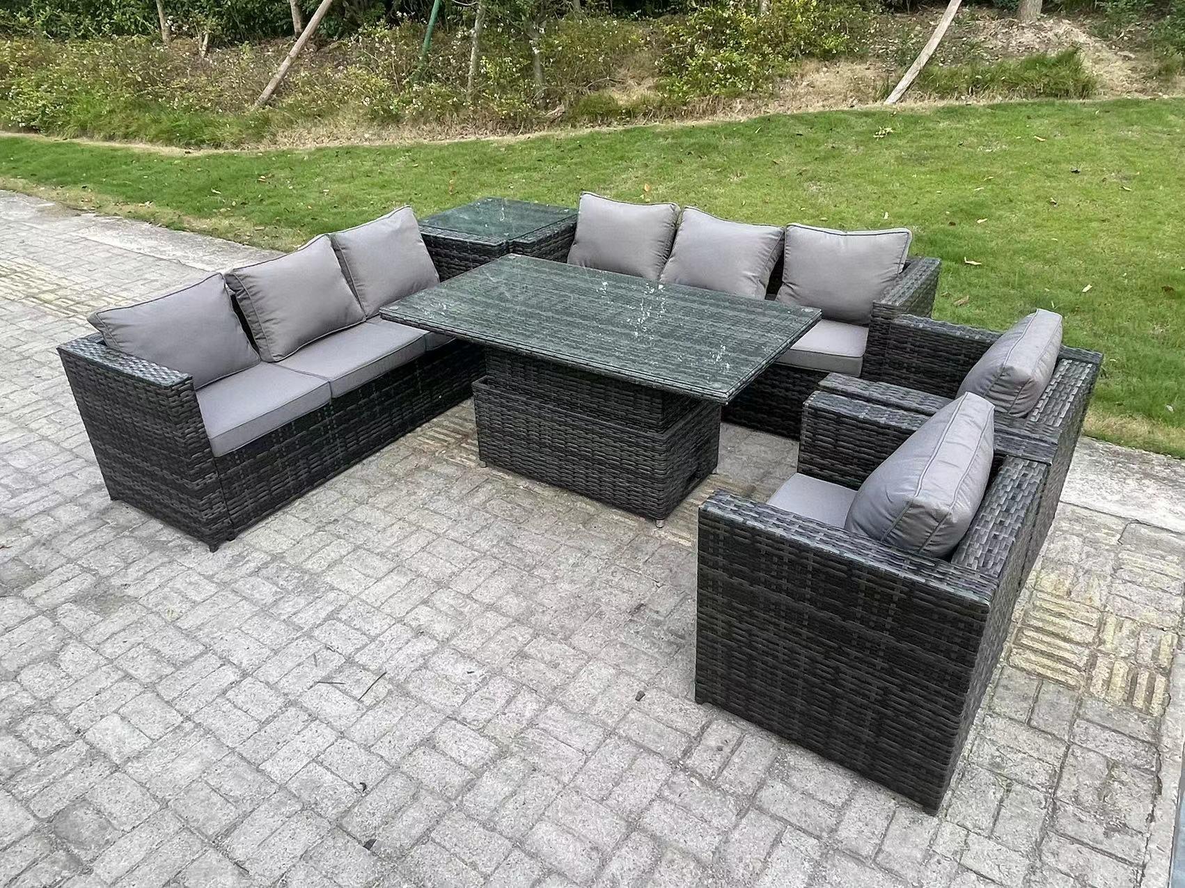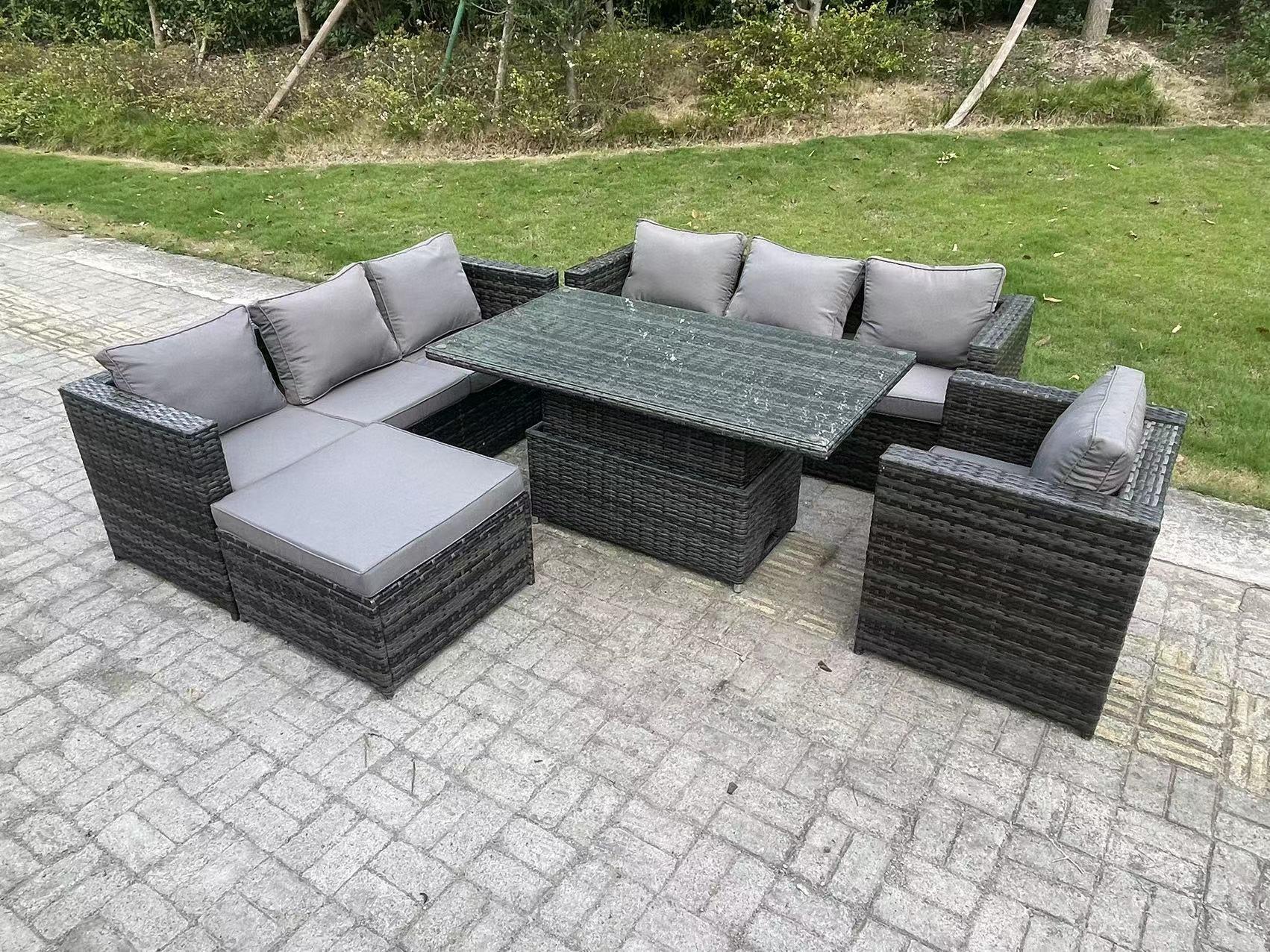 Rattan Outdoor Furniture Adjustable Rising Lifting Rectangle Dining Table Chairs Love Sofa Sets7 Seater