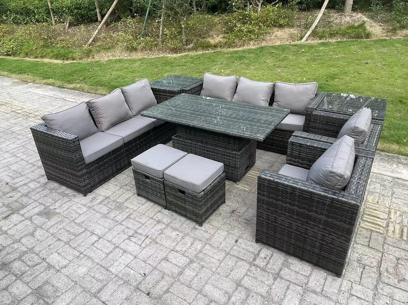 9 Seater Outdoor Rattan Garden Furniture Set Adjustable Rising Lifting Dining Table With Side Table Chairs Stools