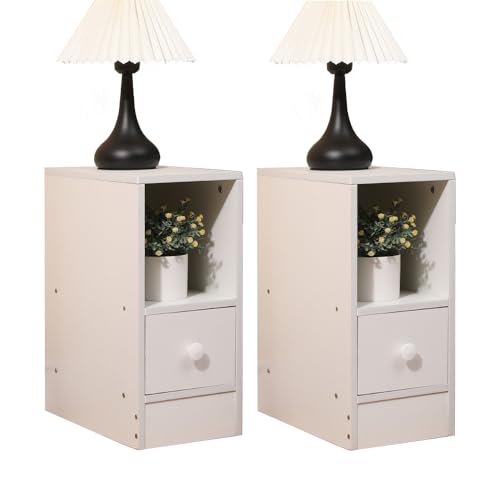 Rainbow Tree Slim Tall Bedside Table Set of 2 with Drawer & Storage Space for Bedroom, Narrow Sofa Side Table End Table for Living Room, Nightstand Telephone Table White
