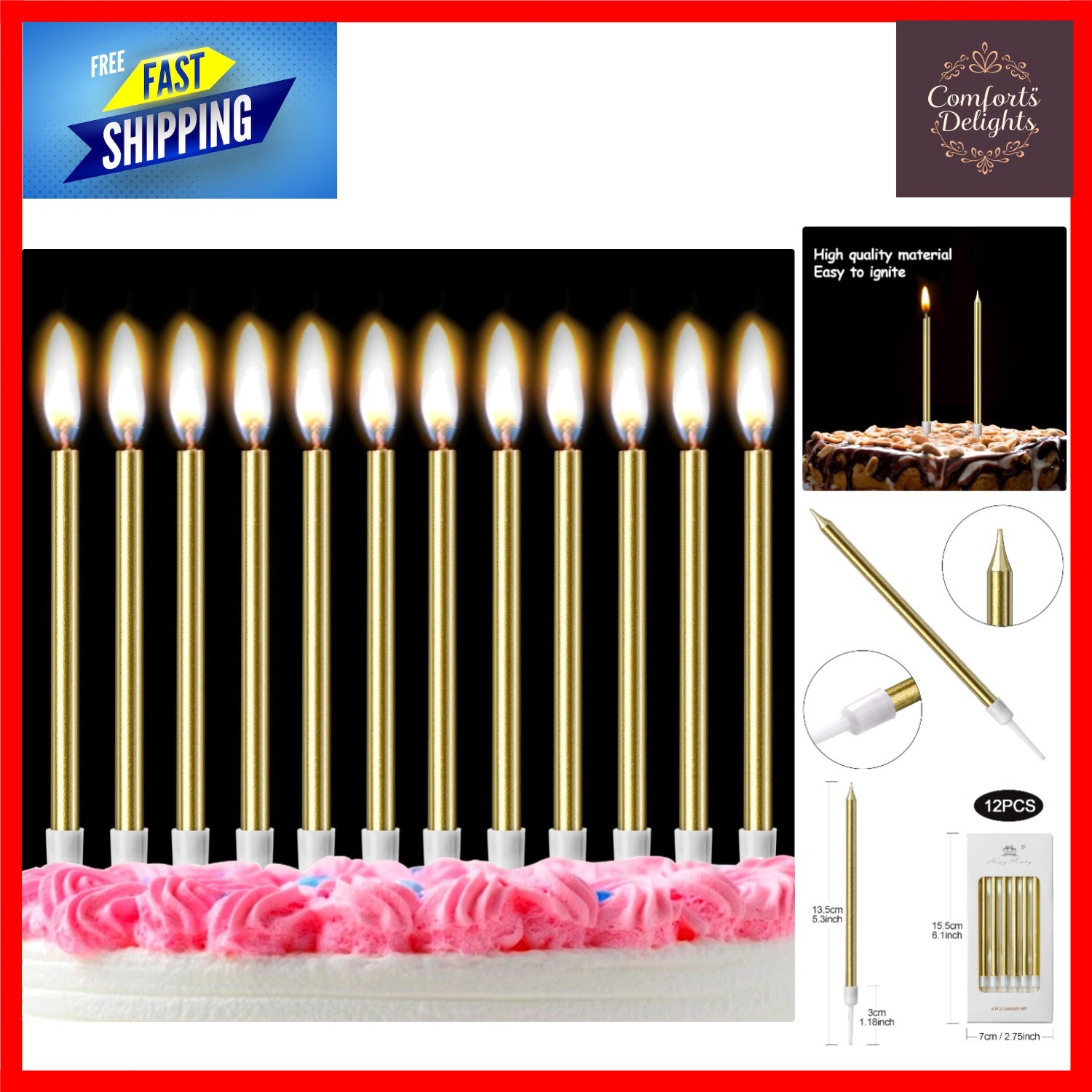 12 Tall Gold Birthday Candles with Holders - Perfect for Weddings & Celebrations