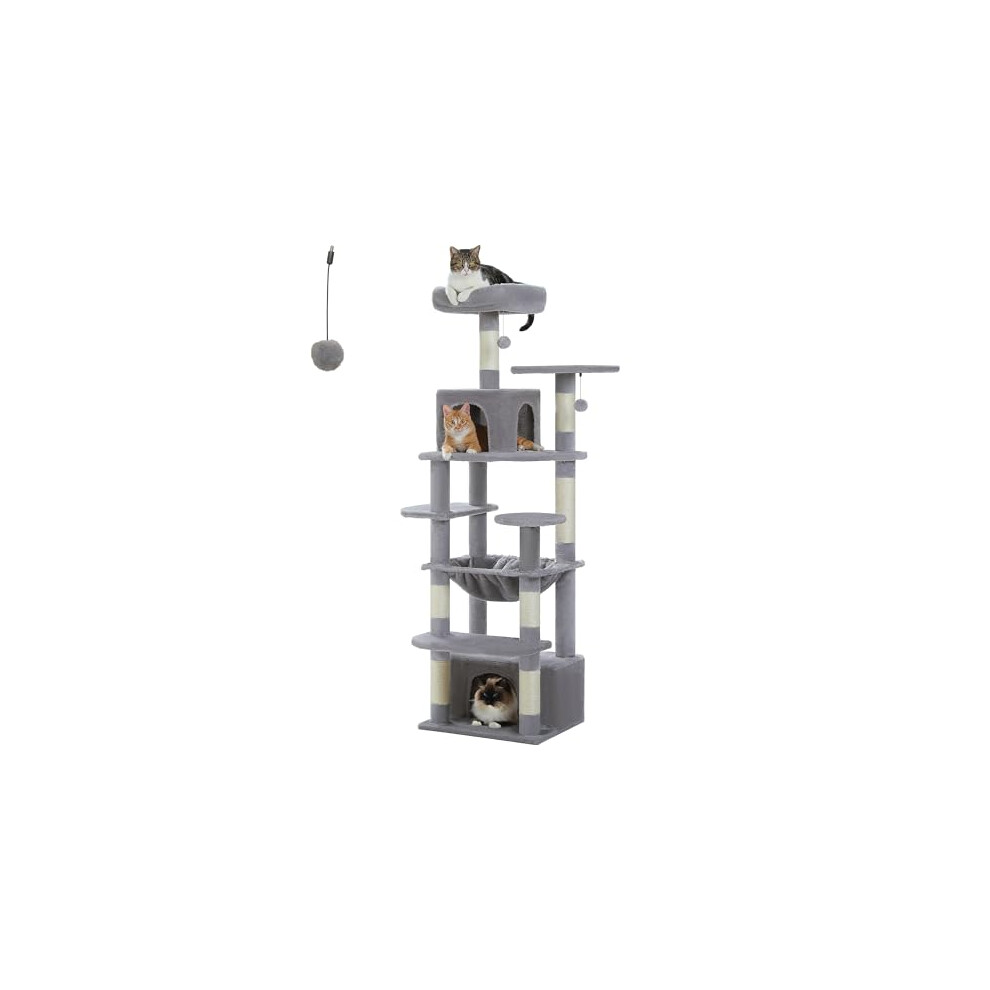 (Dove Grey) Large Cat Tree, 175 cm Tall Cat Tower, Multi-Level Cat Condo with 2 Caves, 2 Baskets, 5 Scratching Posts, Self-Groomer, Perch, Hammock
