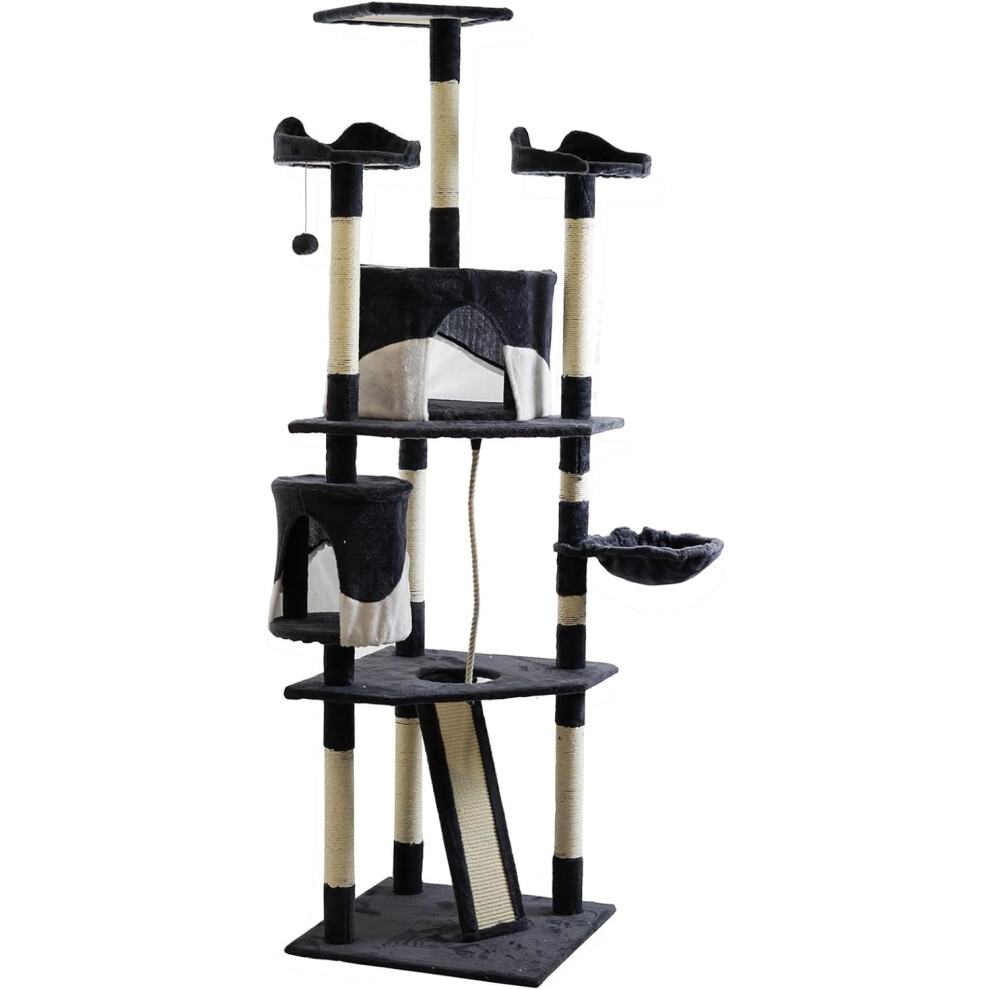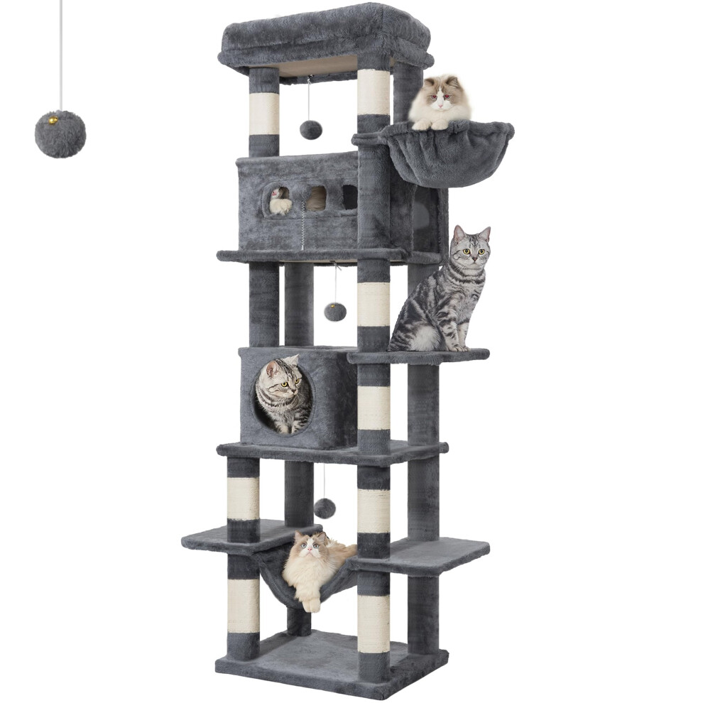 Yaheetech Tall Cat Tree, 178cm Cat Tower w/Scratching Posts, 2 Caves, Perched Platform and 2 Dangling Balls Stable Pet Furniture, Dark Grey