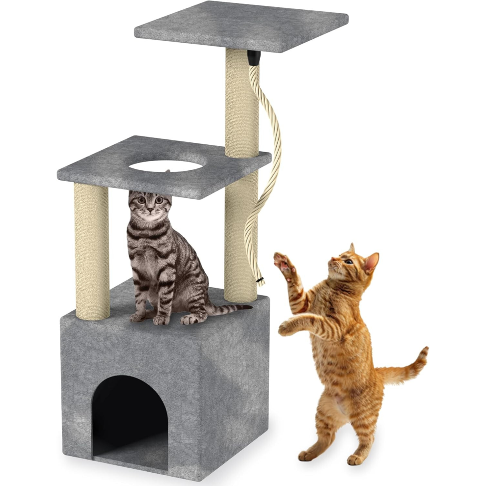 3-Tier Cat Tree Tower, Grey Plush, 32.28" Tall Multi-Level Cat Condo with Hammock, Platform, Scratching Posts for Small Medium Cats