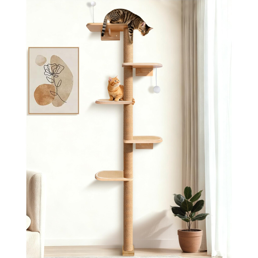 Tall Cat Tree, 5 Tier Floor to Ceiling Cat Tower, WallMounted Scratching Post, Wild Simulation Shelves for Cats Climb, Scratch, Play