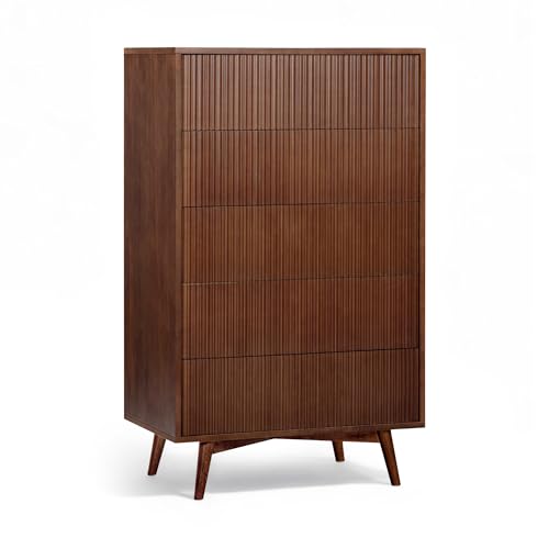 Teamson Home Tremolo 127 cm Tall Walnut Bedroom Dresser Chest of Drawers with 5 Push-Open Drawers, Fluted Wood Detailing and Vertical Storage Design, Walnut