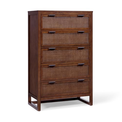 Teamson Home Hatteras 127cm Tall Bedroom Dresser Chest of Drawers with 5 Rattan Inset Drawers, Walnut Finish and Space-Saving Storage Design, Walnut
