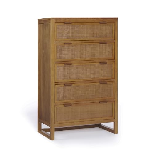 Teamson Home Hatteras 76 cm Wide Tall Bedroom Dresser Chest of Drawers with 5 Rattan Inset Drawers, Acacia Veneer Finish and Compact Storage Design, Natural