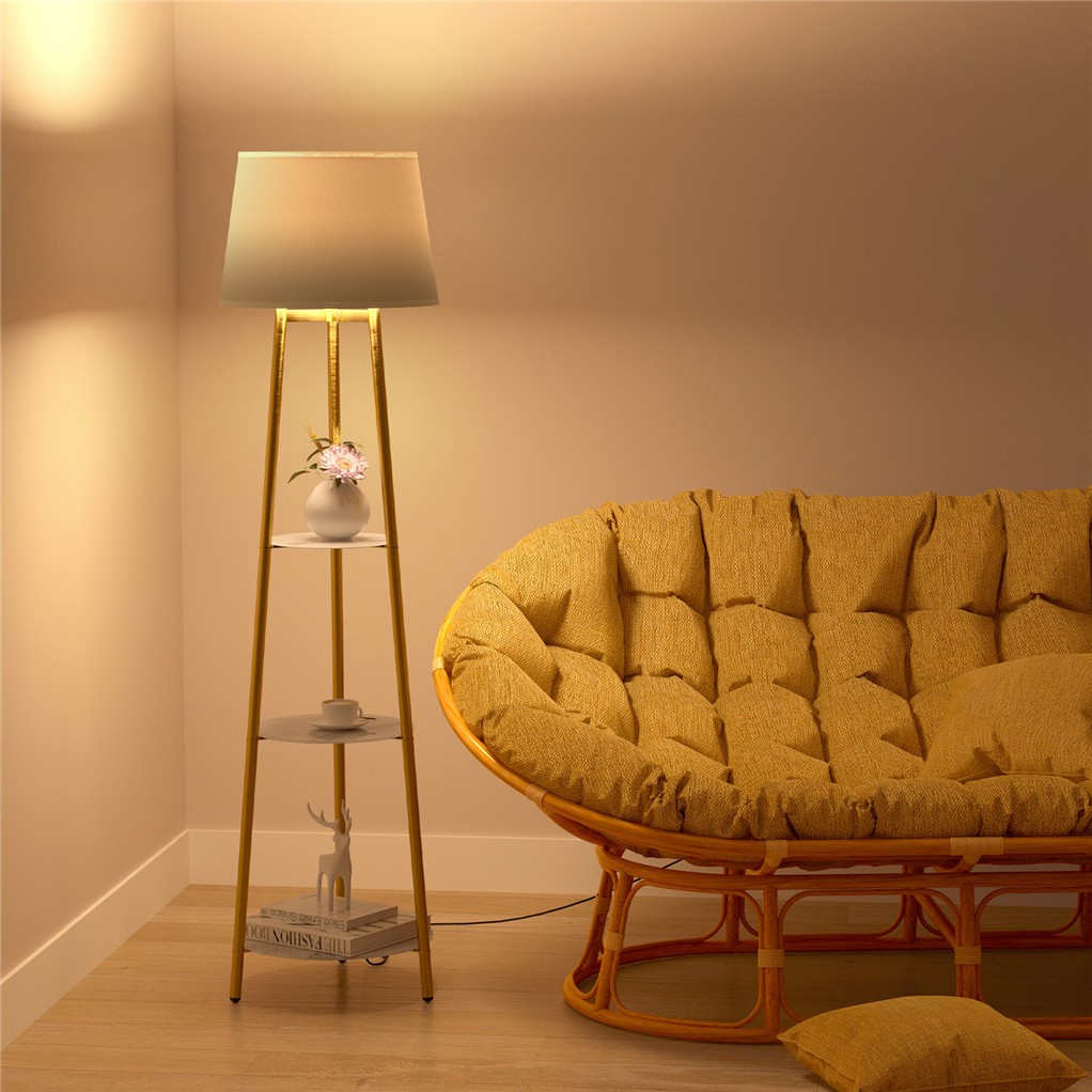 Tall Modern Floor Lamp Light with 3 Tier Storage Shelves Lampshade Gold Frame