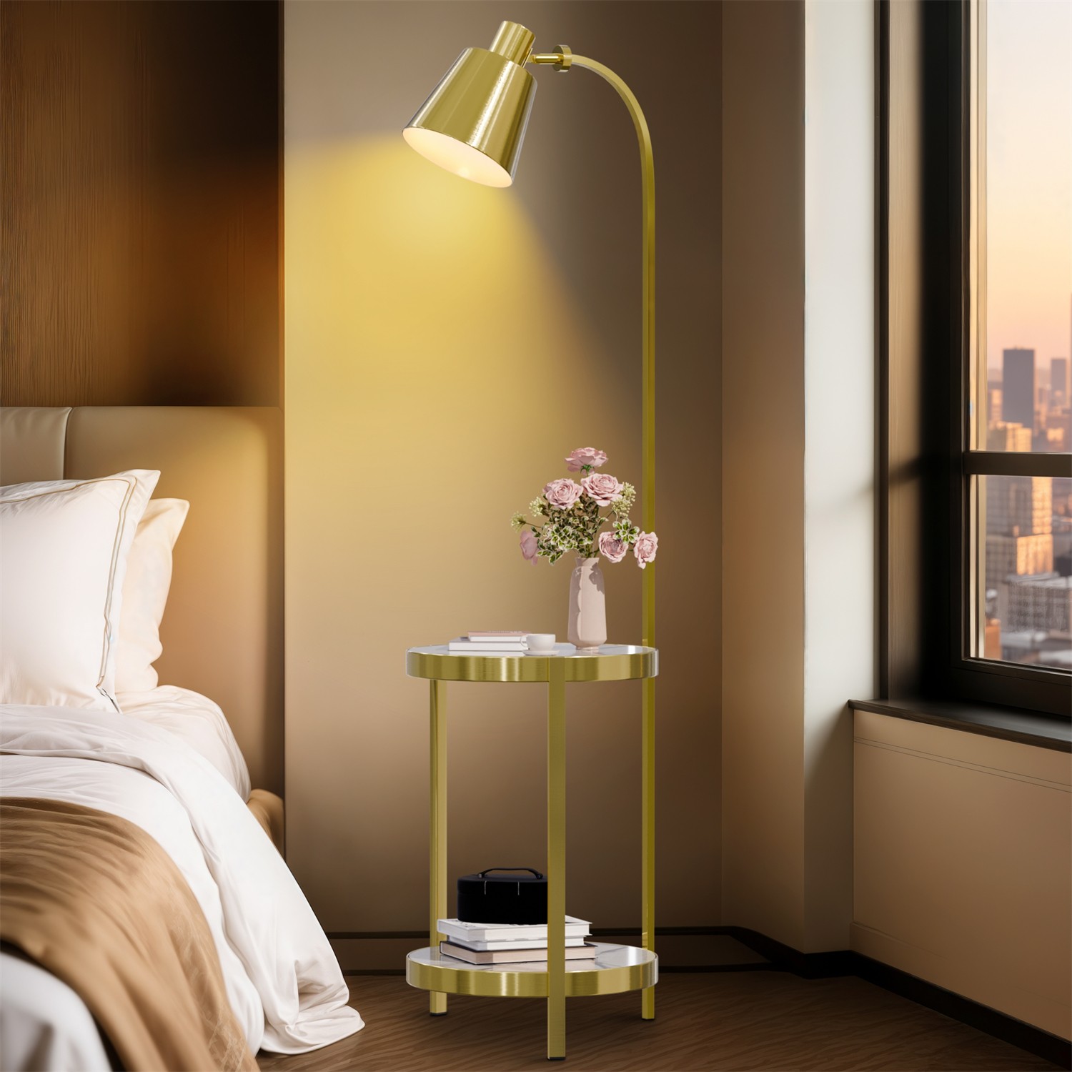 Modern Tall Floor Lamp w/2-tier Storage Shelves Gold Bedside Accent Light Table