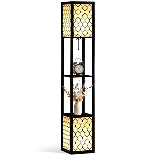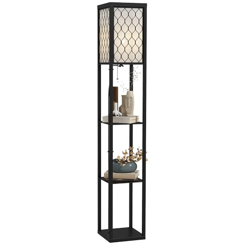 HOMCOM Floor Lamp with Shelves, Single Light, Modern Tall Standing Lamps for Living Room, Bedroom, with Chain Switch, Bulb not Included, Black