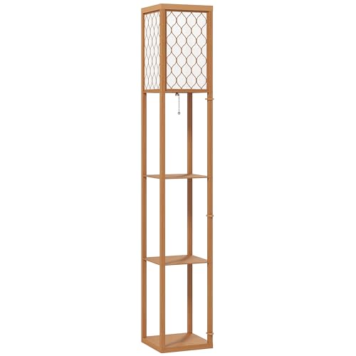 HOMCOM Floor Lamp with Shelves, Modern Tall Standing Lamps with Fabric Lampshade, Chain Switch and Dual Light for Living Room, Bedroom, Bulb not Included, Natural Wood Finish
